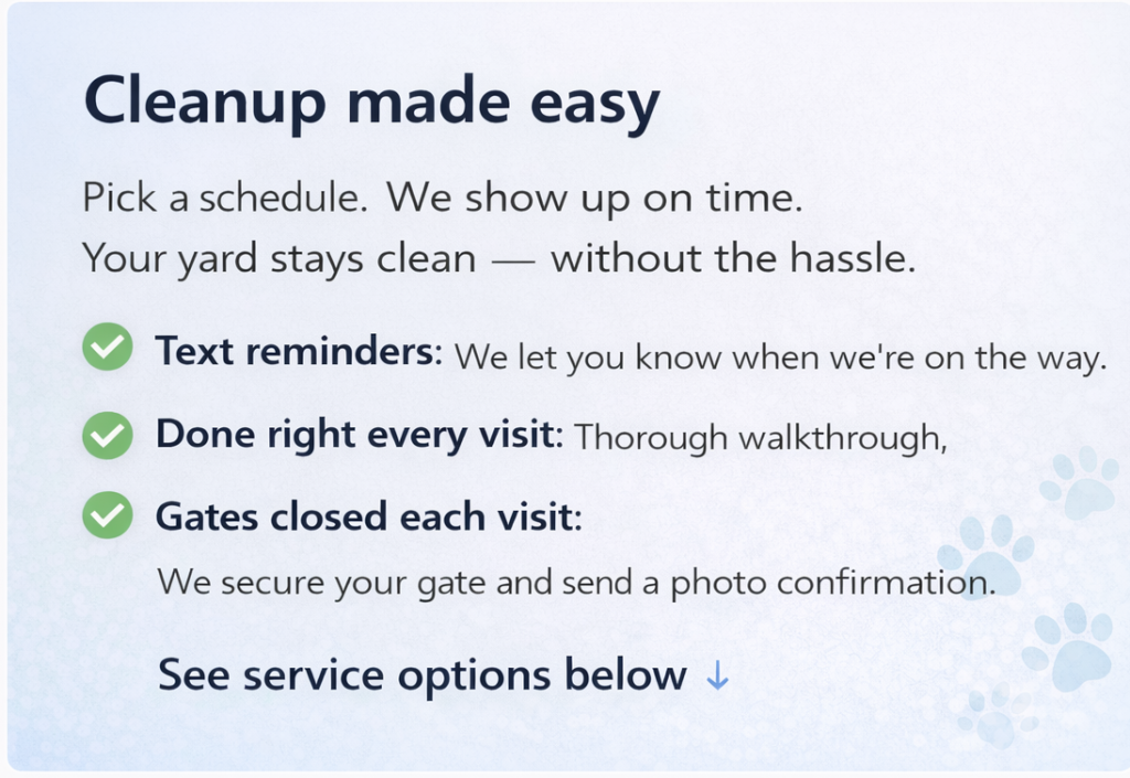 Simple, upfront per-visit pricing, for yards up to 1/4 acre. Waste is bagged an placed in your trash bin